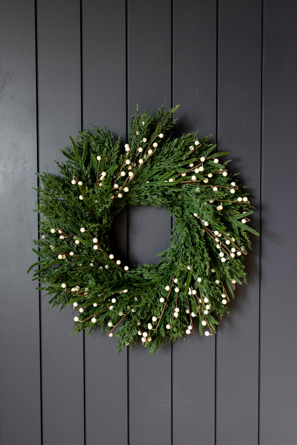 Accented with white plum berries and layered cypress textures, this wreath delivers both sophistication and holiday warmth. Pair it with coordinating garlands, pine stem picks, vintage bells, or velvet ribbons to create a cohesive and inviting seasonal look. Designed for impact, this bestselling style is a holiday favorite that adds lasting charm year after year.