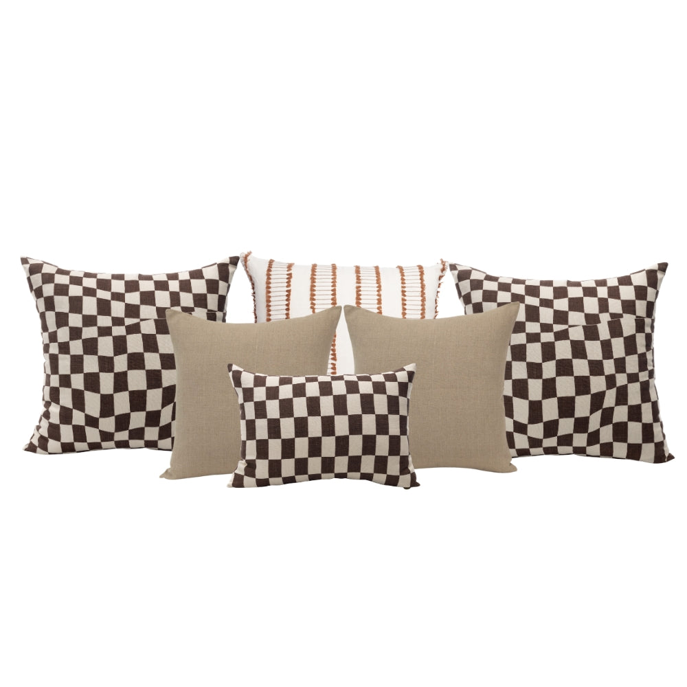 Paired together by our design team, this cohesive pillow set removes the guesswork from mixing patterns and colors, making it effortless to achieve a beautifully curated, designer-approved look. This set blends soothing tones of browns, natural linen and rust with a lively mix of textures and patterns. The result is a refined, layered aesthetic that brings depth, warmth, and relaxed sophistication to your home.