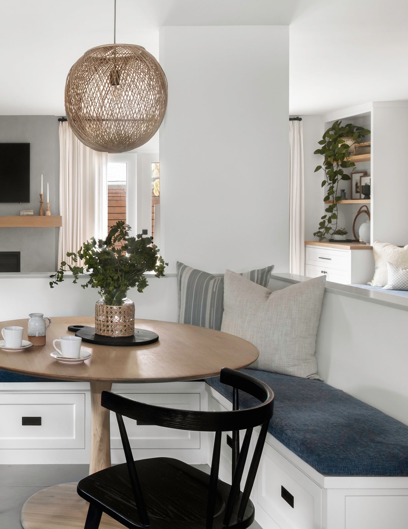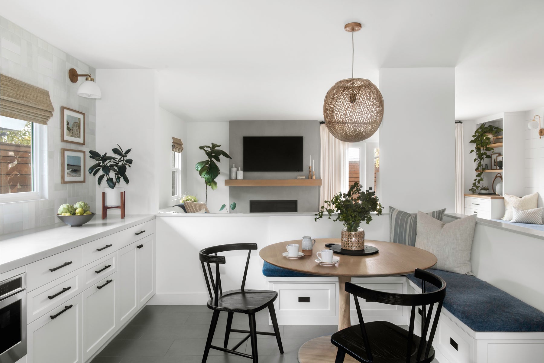 Modern kitchen with round dining table, black chair, and built-in bench with cushions.