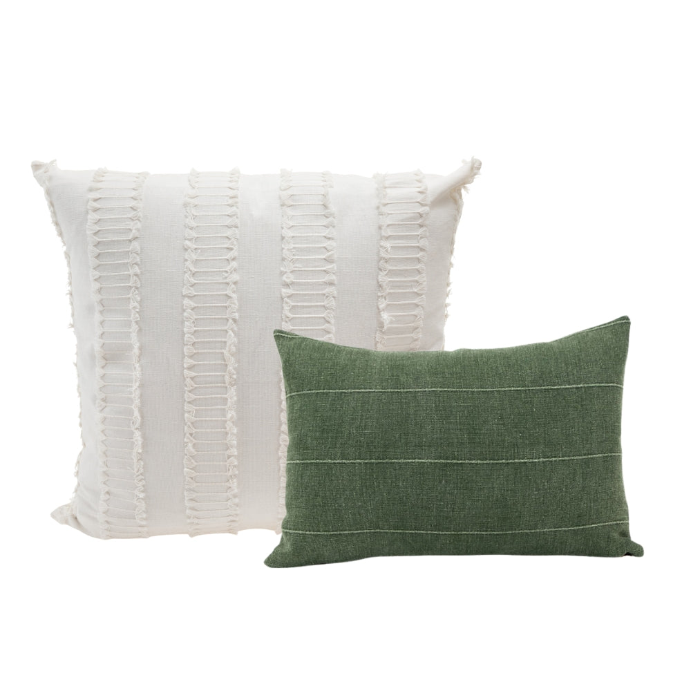 Paired together by our design team, this cohesive pillow set removes the guesswork from mixing patterns and colors, making it effortless to achieve a beautifully curated, designer-approved look. This set blends soothing tones of green and white with a harmonious mix of textures and patterns. The result is a refined, layered aesthetic that brings depth, warmth, and relaxed sophistication to your home.