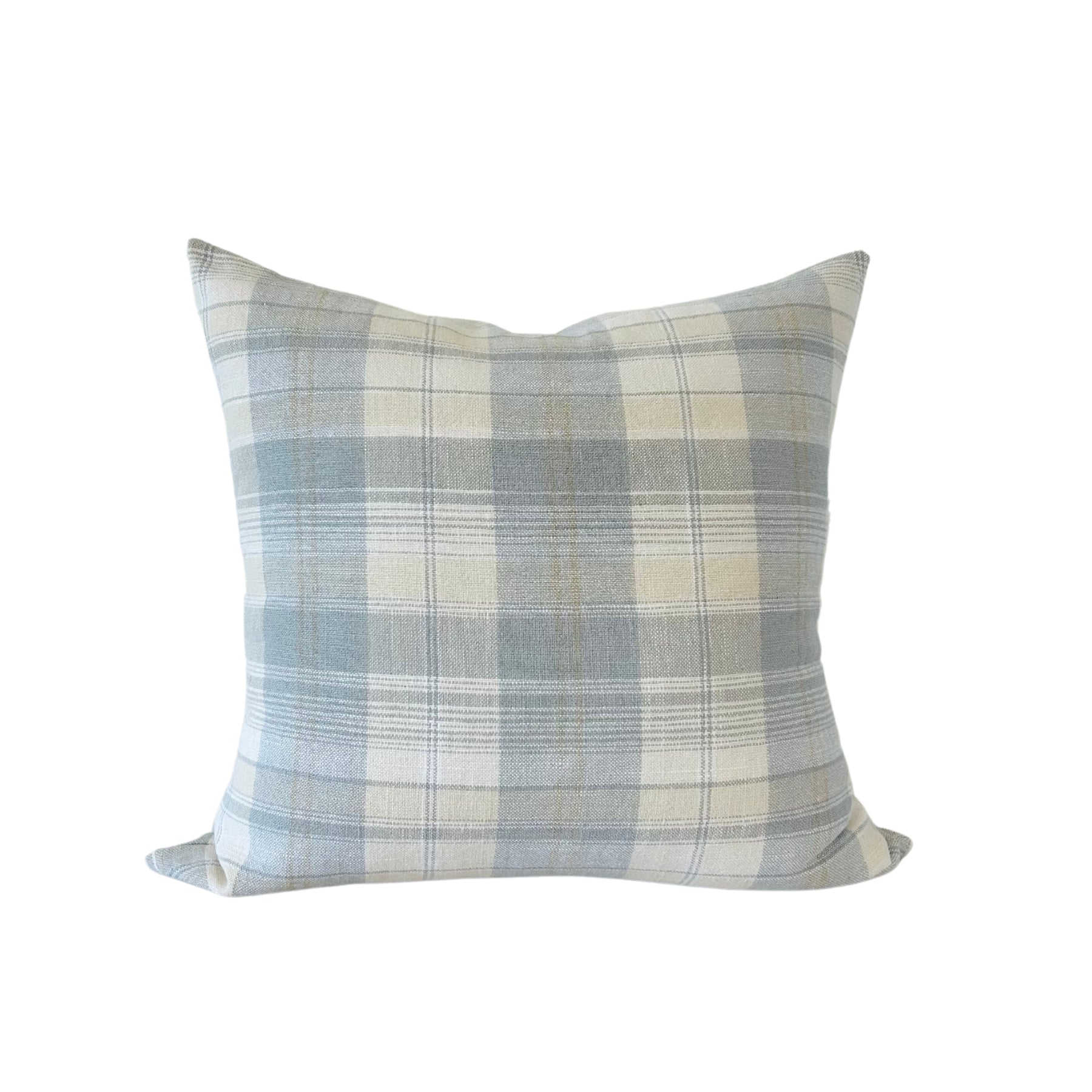 A square-shaped throw pillow with a macro-plaid pattern in blue and oatmeal colors.