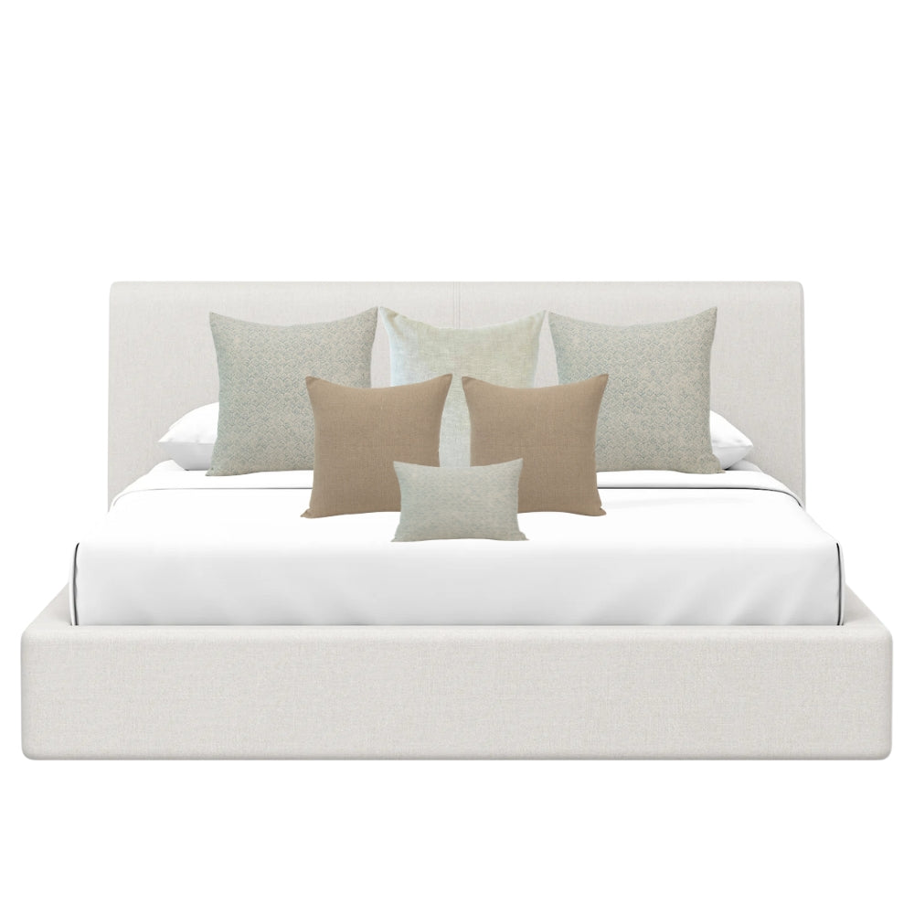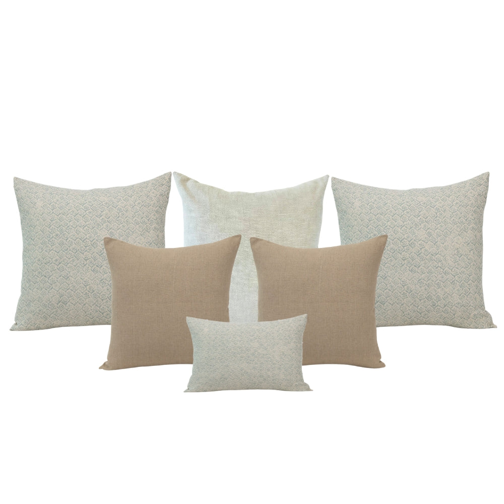 Paired together by our design team, this cohesive pillow set removes the guesswork from mixing patterns and colors, making it effortless to achieve a beautifully curated, designer-approved look. This set blends soothing tones of blue and natural linen with a harmonious mix of textures and patterns. The result is a refined, layered aesthetic that brings depth, warmth, and relaxed sophistication to your home.