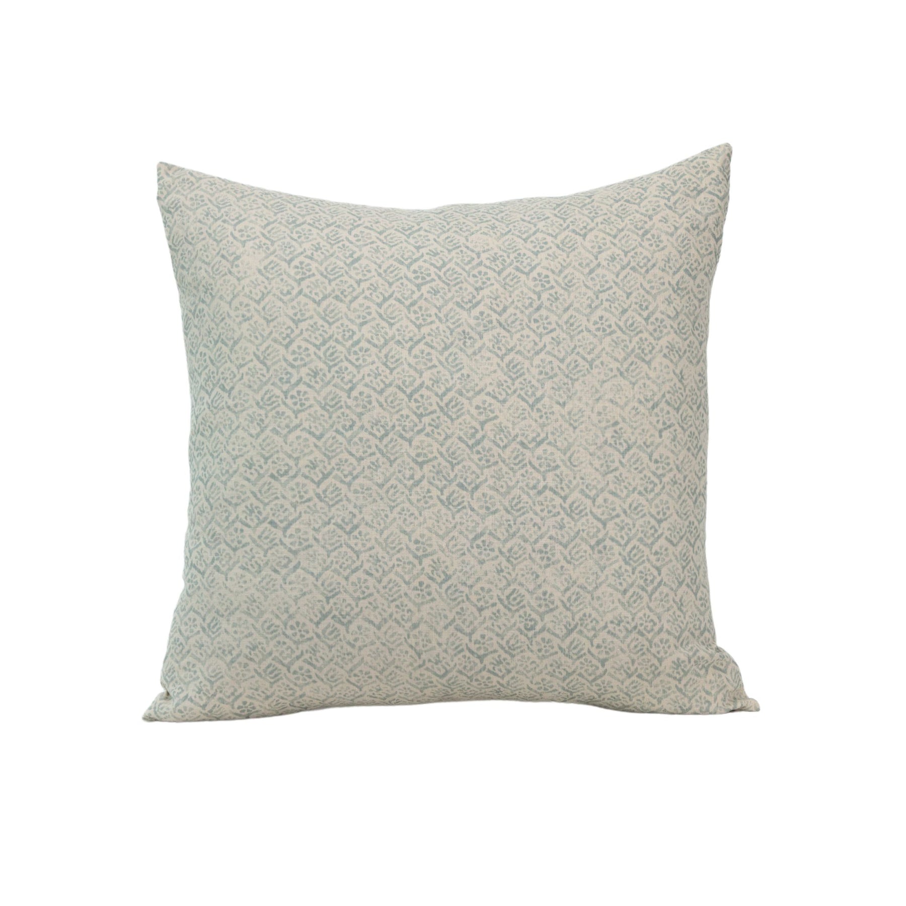 A square-shaped throw pillow with a small-scale floral pattern in muted colors, made from hemp fabric.