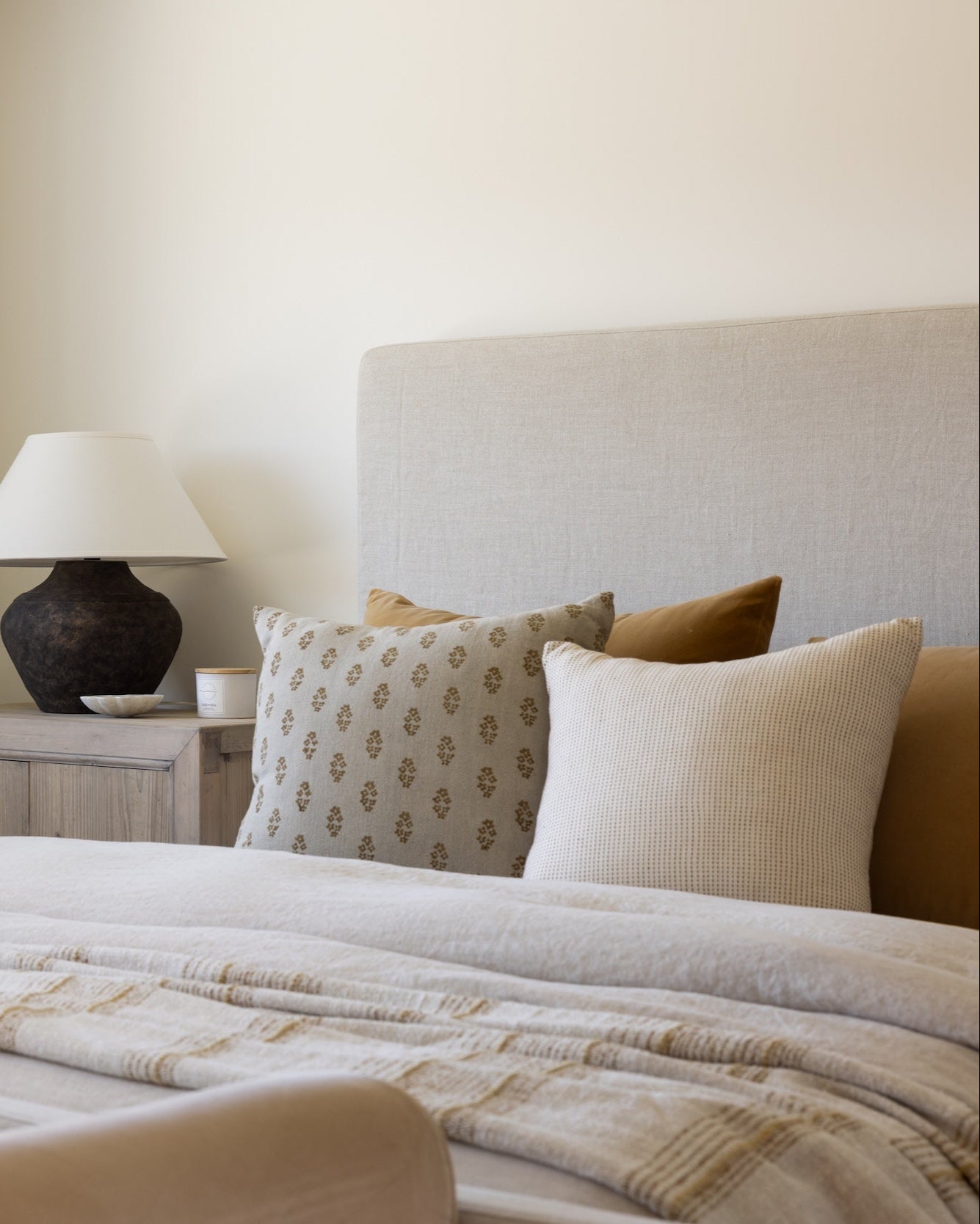 Bedroom with a bed featuring patterned and solid pillows, a lamp on a nightstand, and neutral walls.