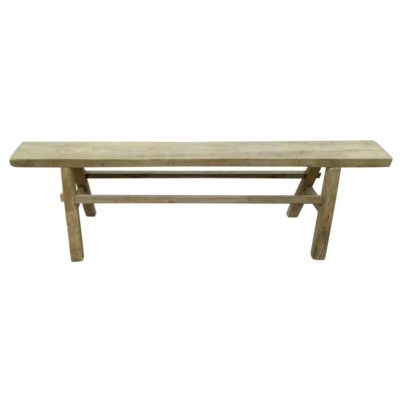 A vintage wooden bench with a natural weathered finish.