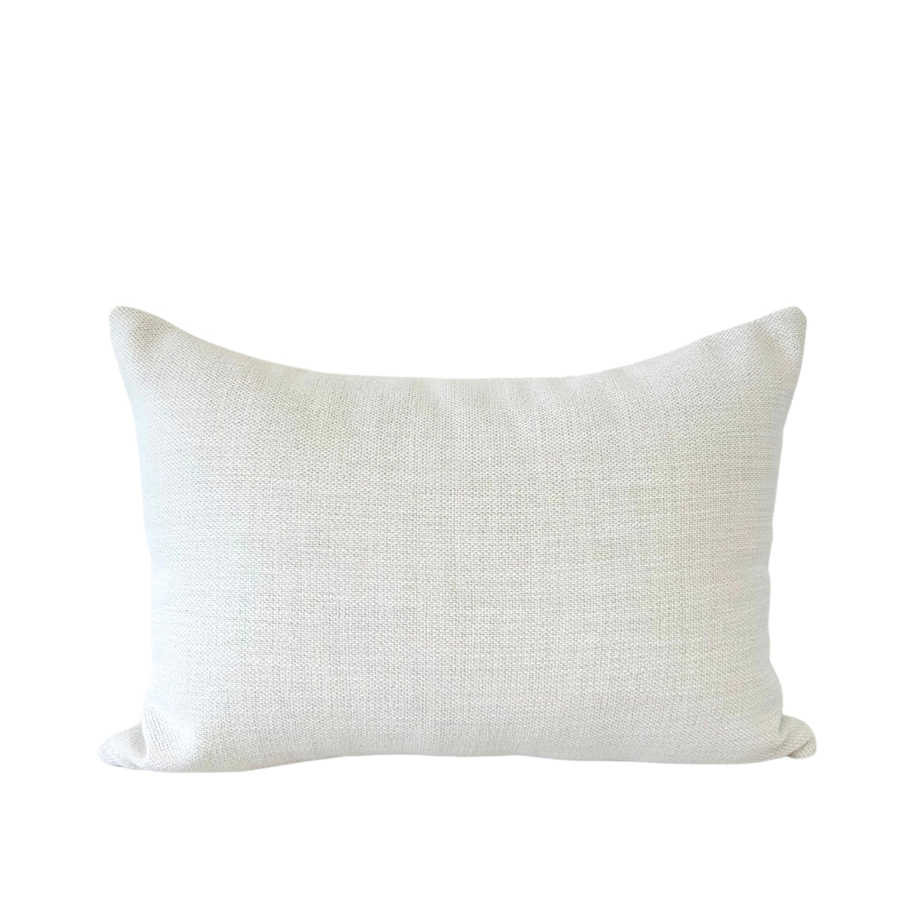A rectangular throw pillow with a neutral white and cream woven texture, handcrafted in the USA.